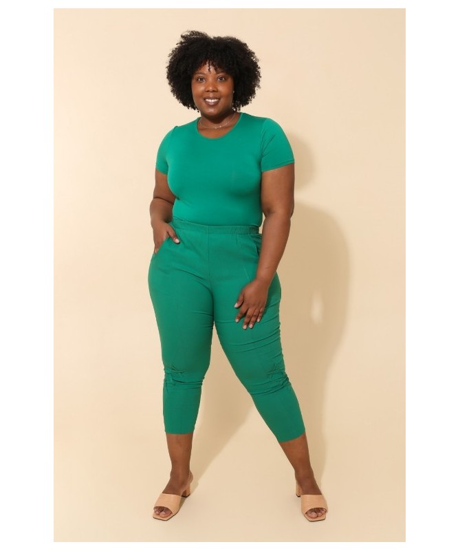 Pantacourt taillé dans un tissu doux et extensible, présentant une taille haute élastique qui épouse et flatte la silhouette, ainsi que des détails froncés sur les côtés pour une touche de style. Facile à porter avec des sandales ou des talons compensés, cet ensemble est parfait pour ajouter une touche de couleur et de fraîcheur à votre garde-robe estivale. Disponible du 46-48 au 58-60 en vert émeraude, bleu foncé, beige, rose, noir