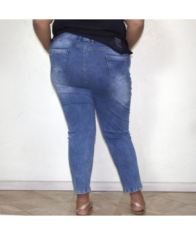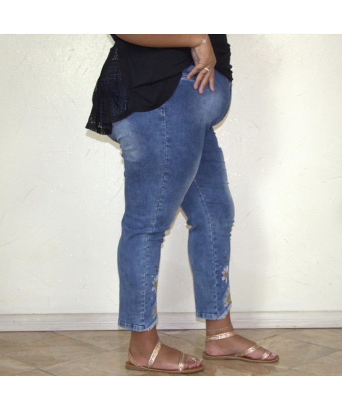 Nom : Jean "Sofia" Coupe : Droite, longueur cheville Taille : Demi-élastiquée, bouton + zip Détails : Broderies florales et papillons, strass brillants, finition bord franc Style : Frais, printanier, romantique Disponible en grandes tailles Idéal pour : Un look doux et féminin, parfait pour la mi-saison