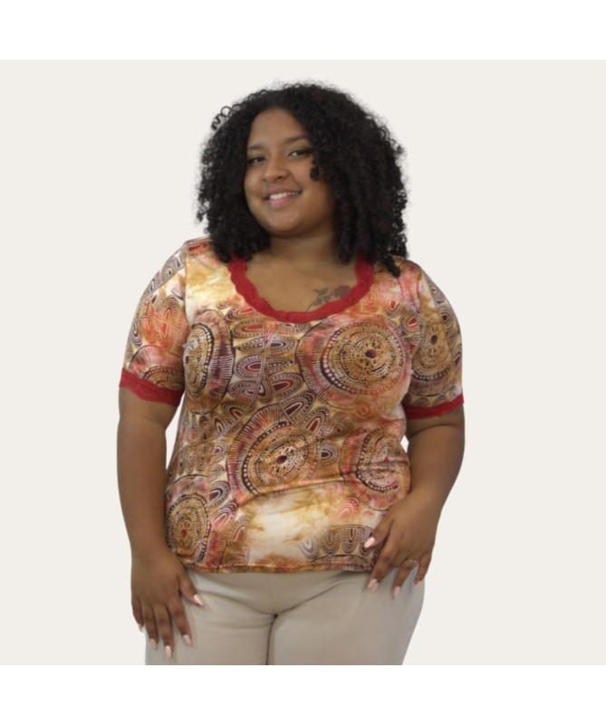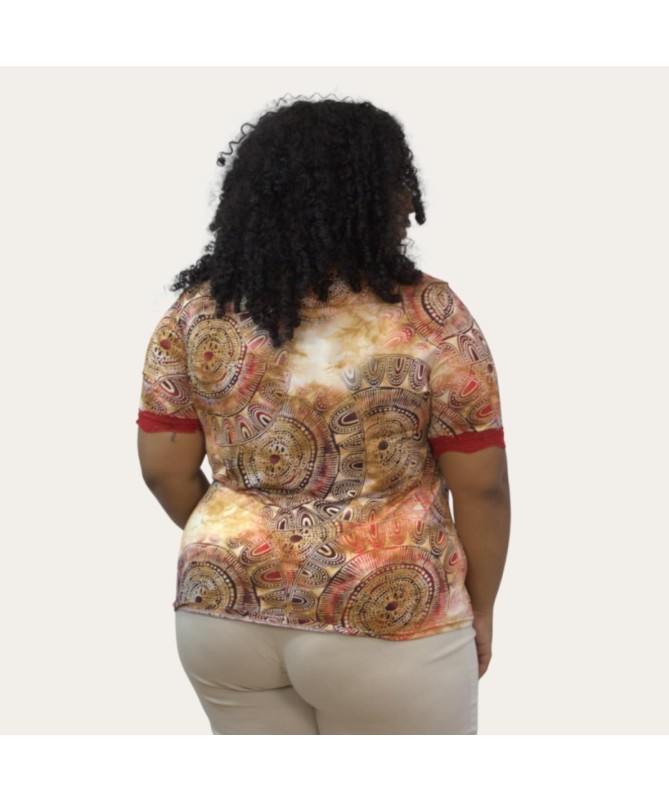 Ce haut est un t-shirt à manches courtes présentant un motif circulaire orné de teintes chaudes telles que le rouge, l'orange et le beige. Le décolleté en V est délicatement souligné par des détails en dentelle rouge, ajoutant une touche d'élégance. Sa matière est douce et fluide, offrant un confort optimal pour un port quotidien.