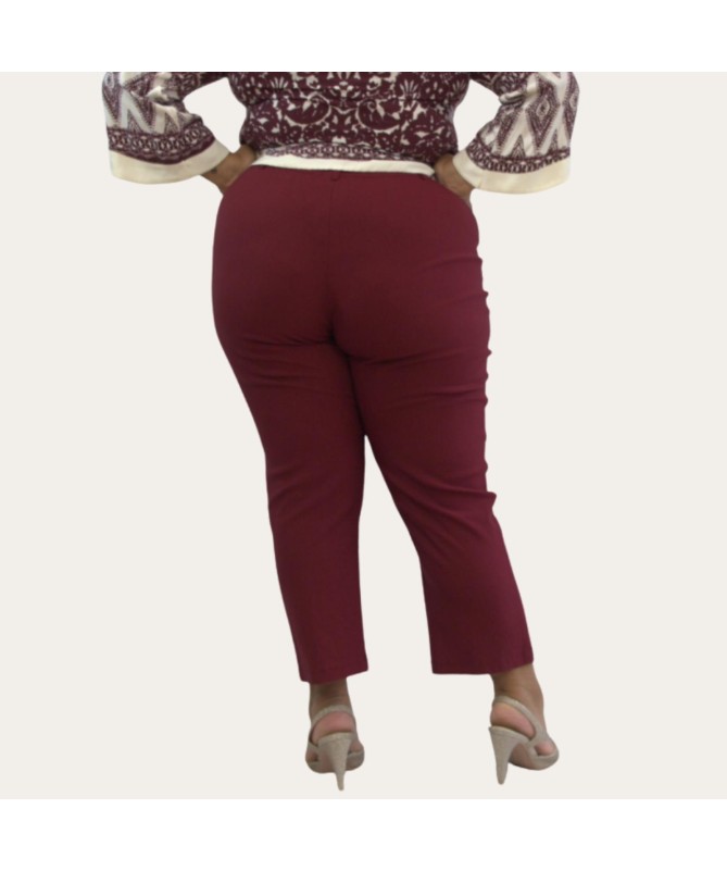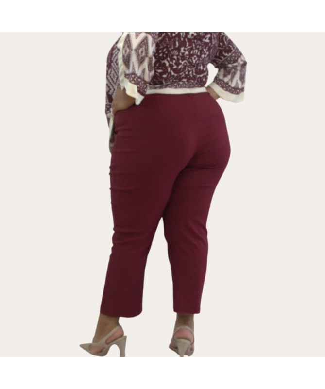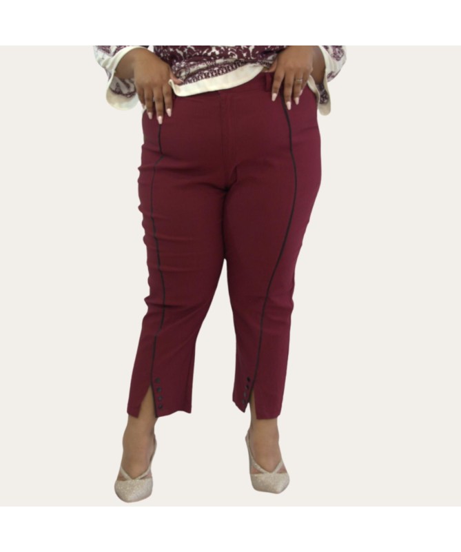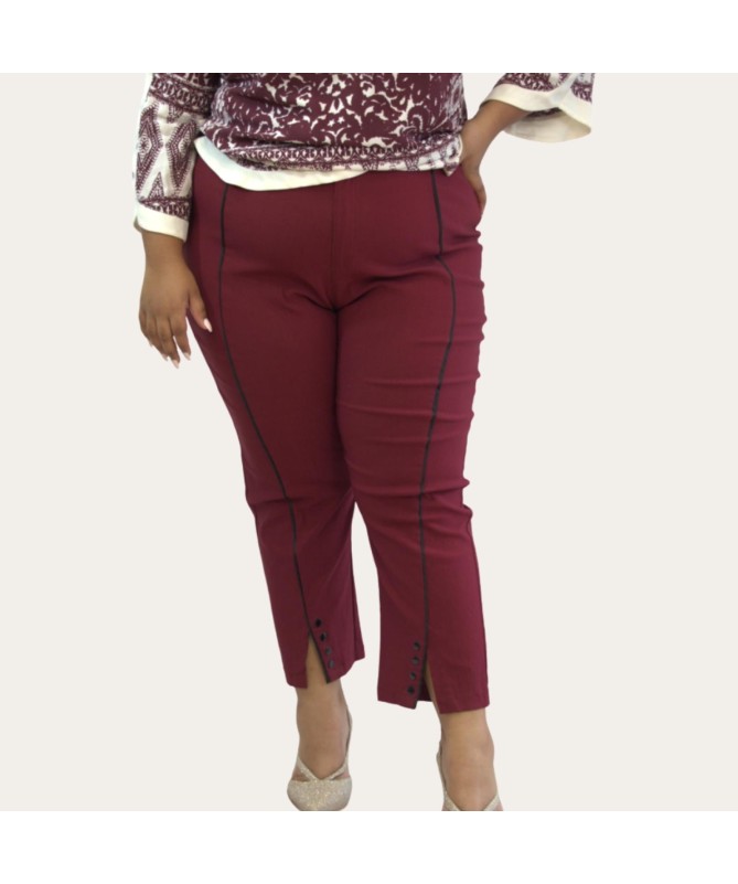 Couleur : Bordeaux avec surpiqûres noires Coupe : Ajustée, longueur 7/8 Taille élastiquée à l’arrière pour plus de confort Détails mode : Fentes avec boutons décoratifs en bas de jambe Matière souple et agréable à porter Idéal pour : Bureau, sorties, looks chics du quotidien