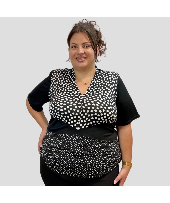 T-shirt fluide imprimé Noir et blanc Motifs géométriques contrastés, col en V, coupe ample Élégant et graphique Parfait pour un look chic décontracté ou un style moderne