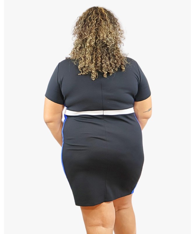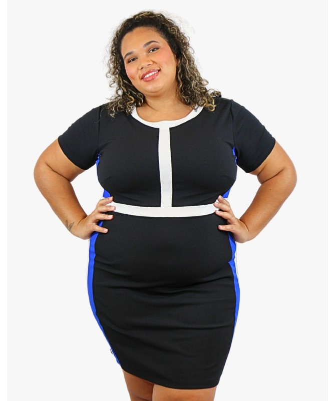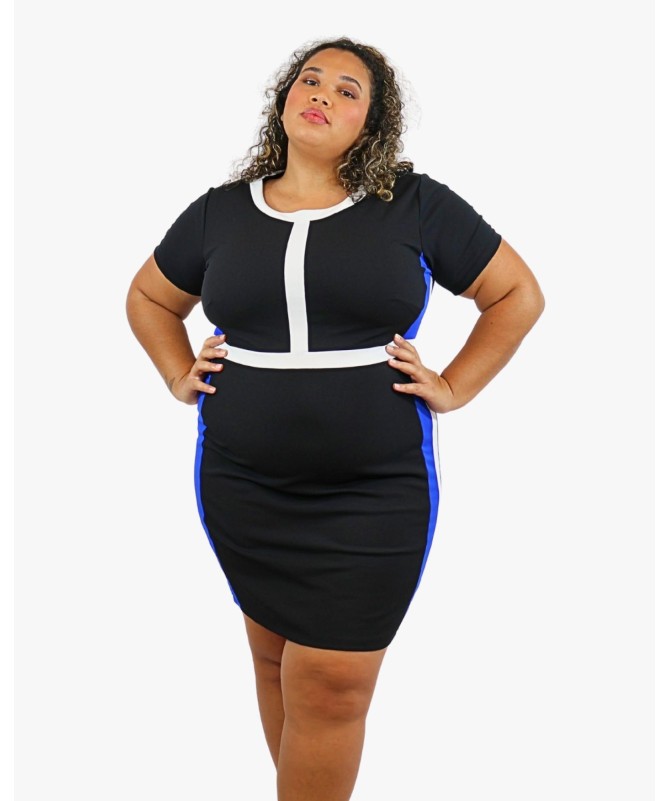 Chic et moderne, la robe “Milan” sublime les courbes avec élégance. Sa coupe ajustée et son jeu de bandes contrastées créent un effet visuel amincissant et structuré. Le mélange du noir, du blanc et du bleu royal apporte une touche dynamique et sophistiquée. Parfaite pour le bureau, une sortie ou une soirée, elle allie confort et style avec son tissu stretch et son design flatteur.