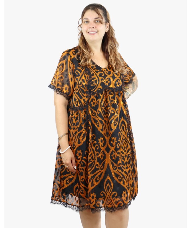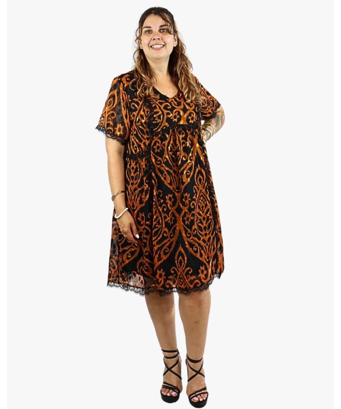 Coloris : Noir et orange brûlé Encolure : V flatteur Manches : Courtes avec finition en dentelle Coupe : Évasée, confortable et légère Longueur : Genou Détails : Dentelle fine sur les bords, motifs baroques élégants Doublure intégrée pour plus d’opacité