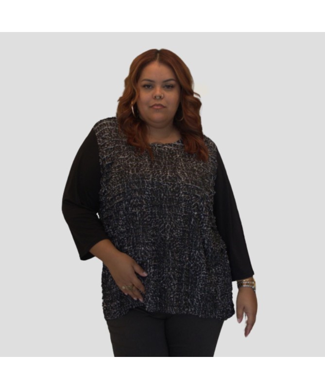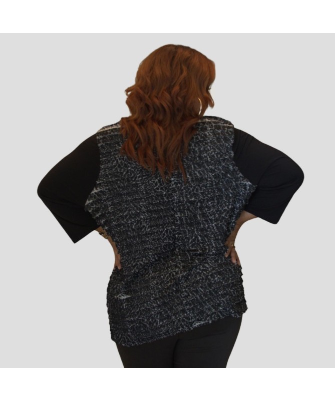 - Type : Top à manches longues - Motif : Texture métallique - Couleurs : Noir et argent - Matière : Tissu texturé avec effet métallique - Caractéristiques spéciales : Panneaux contrastés, finition brillante - Tailles disponibles : 4(52), 5(54)