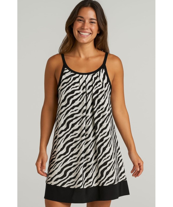 Robe imprimé zèbre marine et blanc TU du 48 au 54 Encolure ronde et fines bretelles Coupe évasée et fluide Bande noire unie sur le bas Tissu léger et agréable à porter