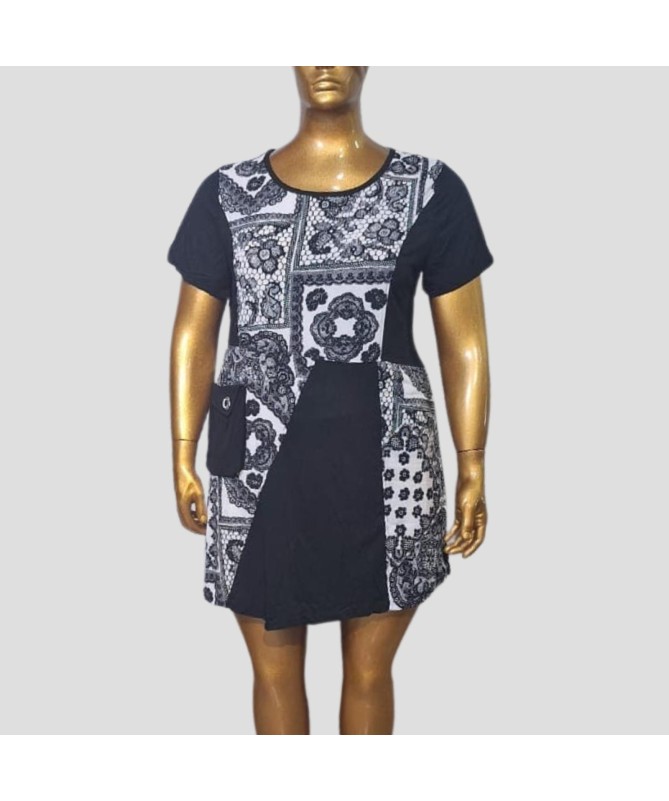 Mettez en valeur votre style unique avec cette robe patchwork audacieuse, qui combine des motifs en noir et blanc pour un look à la fois classique et contemporain. Cette robe est caractérisée par une variété de motifs, incluant des fleurs et des designs géométriques, créant un contraste visuel captivant. La coupe ajustée et évasée met en valeur la silhouette, tandis que les manches courtes et le col rond ajoutent une touche de simplicité élégante. Pratique, elle est dotée de deux poches latérales pour une fonctionnalité accrue. Idéale pour un événement décontracté ou une journée au bureau, cette robe est un choix parfait pour celles qui cherchent à combiner confort et style.